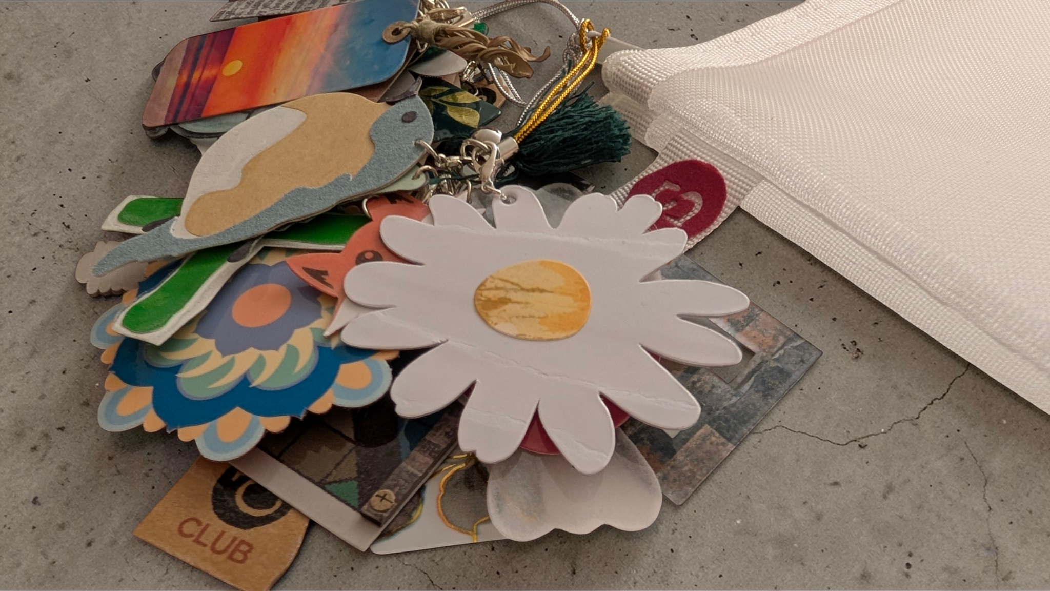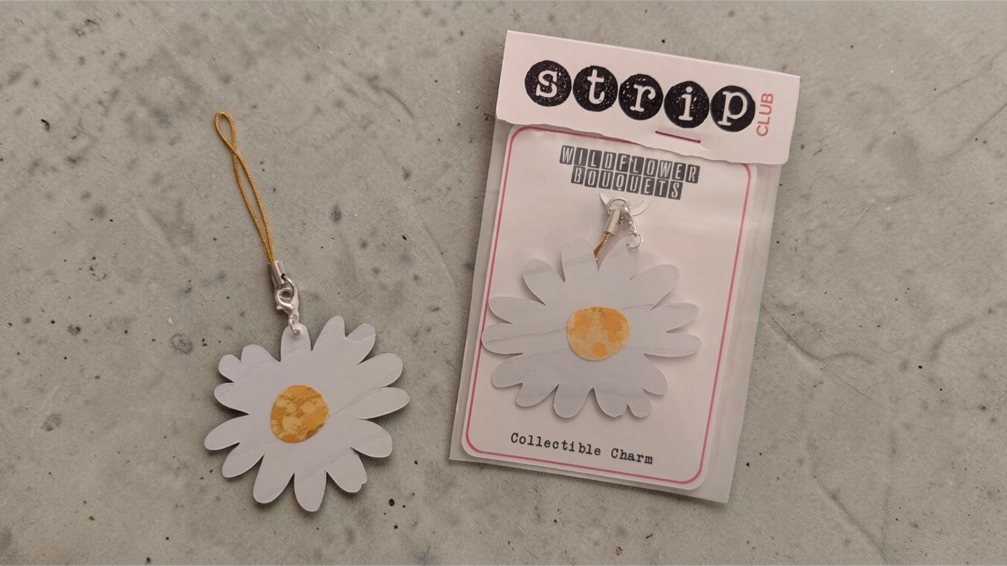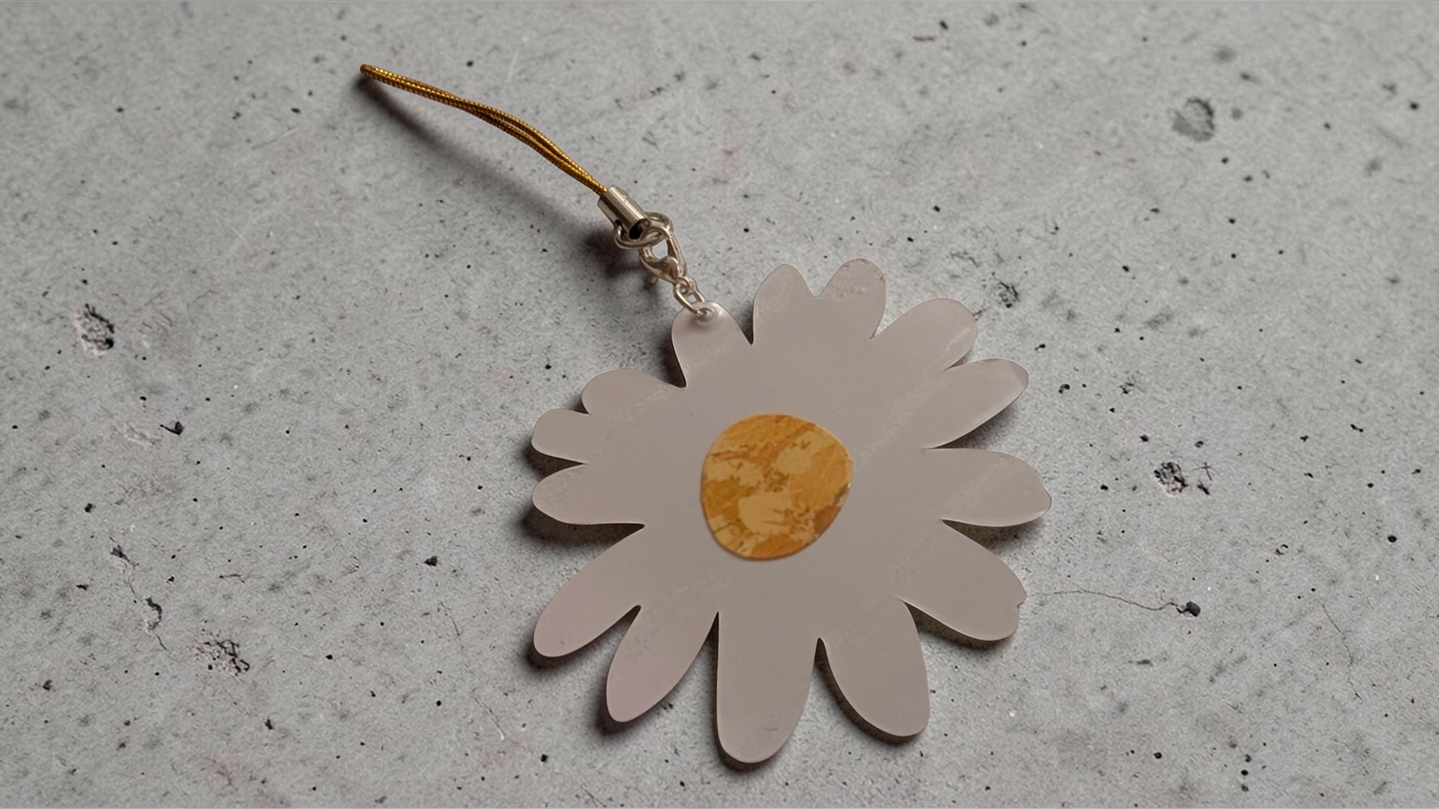 Daisy Flower Charm with silver tone metal ring and lobster clasp. Measures about 2" x 2.5". Includes 2.25" long gold tone zipper pull lanyard.